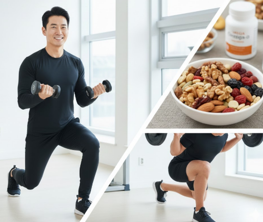 - 해결책: 유산소 운동(걷기, 조깅)만으로는 부족합니다. 주 2~3회 스쿼트, 런지 같은 하체 위주의 근력 운동을 병행하세요. 하체 근육은 남성 호르몬(테스토스테론) 분비를 촉진하는 보물창고입니다.