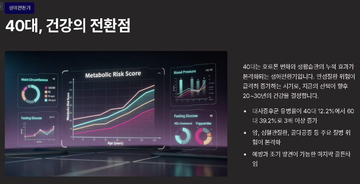 40대는 호르몬 변화와 체력 저하가 본격적으로 시작되는 시기로, 작은 생활 습관의 차이도 건강에 큰 영향을 주는 중요한 시기예요.